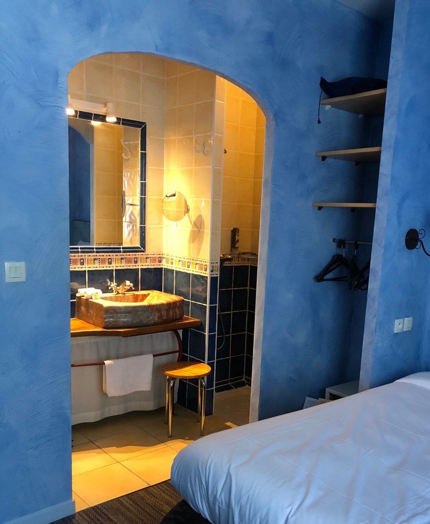 It had looked from our research like a small tourist hotel, the kind that families go to for a week on a full board basis and where they keep your wine bottle from one evening to the next…. And we were right. It was fine, we only needed somewhere to stay the night, we were able to eat safely outside and the sponged blue walls of the room were cool and peaceful.