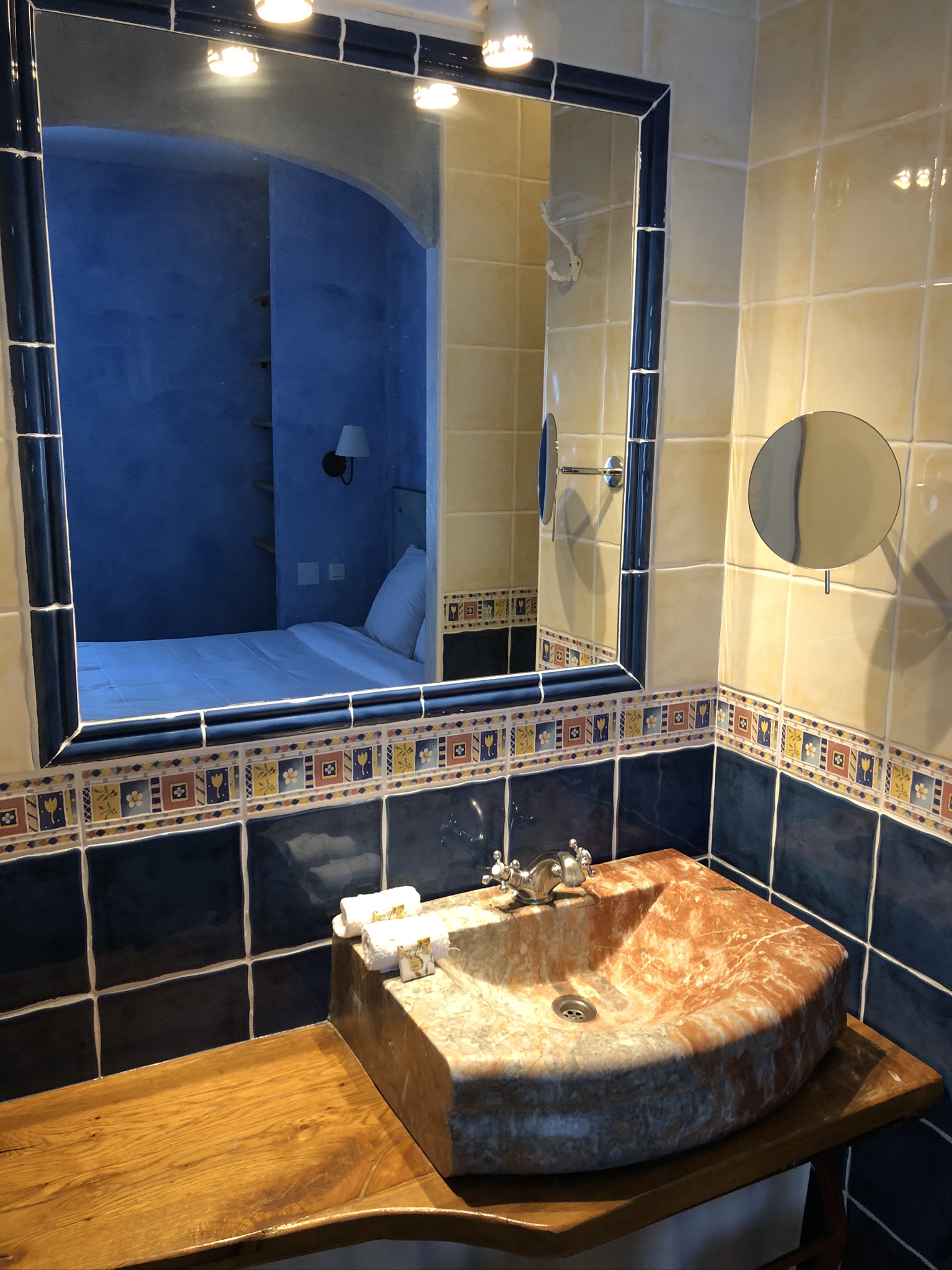 Then we turned on the lights and the bathroom area sprang into glorious technicolour life, eclipsing the cool blue calm and imprinting its bright colours on our retinas.
