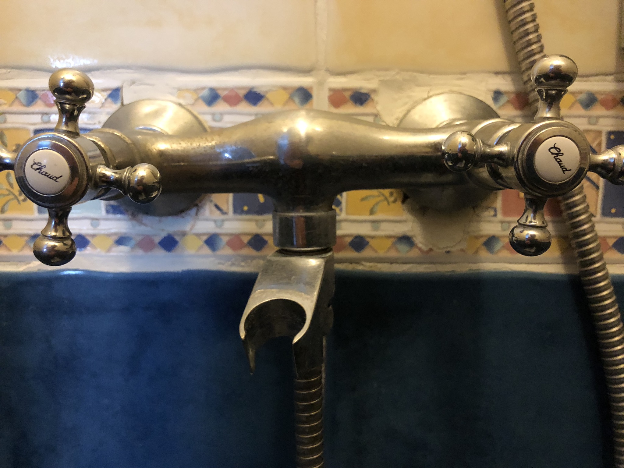 The basin seemed to have been hewn out of a whole block of red marble; it sat there looking huge and smug as the jolly line of Provençal-style tiles skipped around it shouting “Look! We’re Provençal tiles! Wheeeeee!” and the surrounding blue and yellow tiled walls took up the chorus, slightly out of tune like someone singing more with gusto than skill.