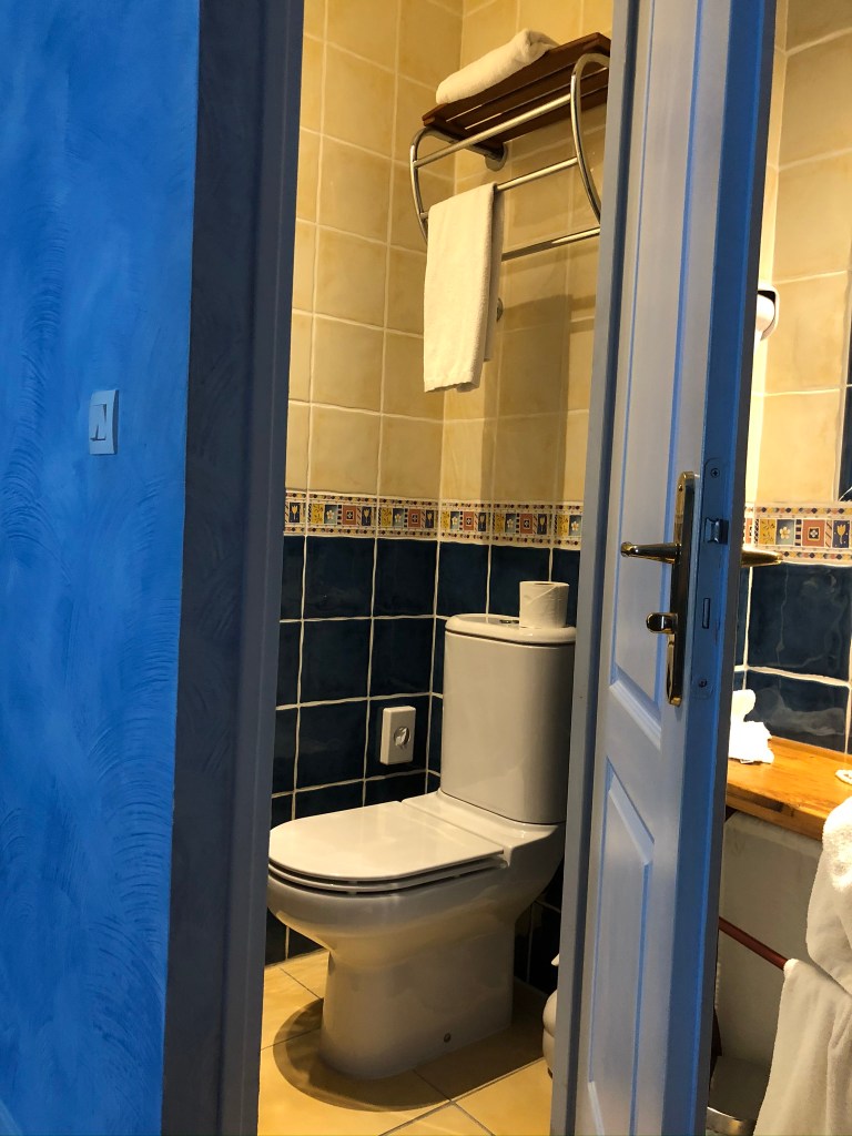 After a good deal of blinking and wondering whether to don sunglasses, we dared take a look at the shower and loo. The loo really should have been furnished with a crowbar and a jar of Vaseline because folding oneself into and out of it took the skills of an under-fed Houdini, while still coping with the sensory overload of the colour scheme.