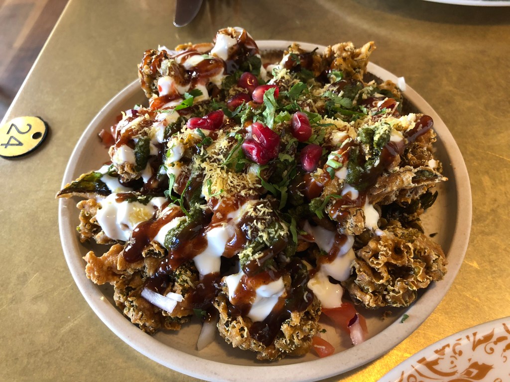 We headed straight to the “chaat” section and went for kale pakora chaat, then from the “small plates” we had Bombay prawns and squid koliwada with a side plate of Kukurit Bhindi. The chaats are meant to be the smaller plates. Someone needs to tell Bandook’s chef this vital but clearly missing piece of information – here is a picture of the really not very small at all kale pakora chaat, with really interesting battered and crispy kale: