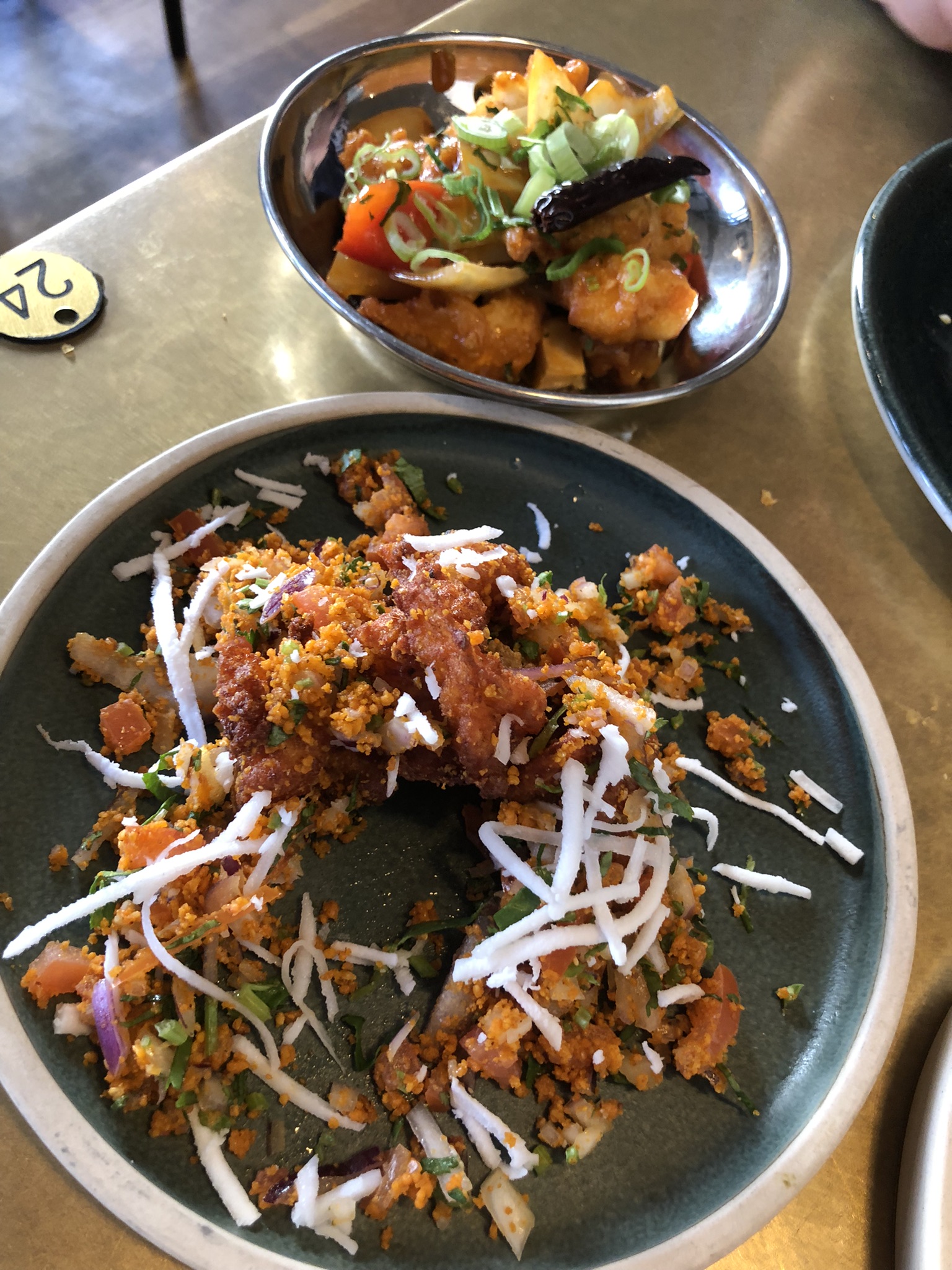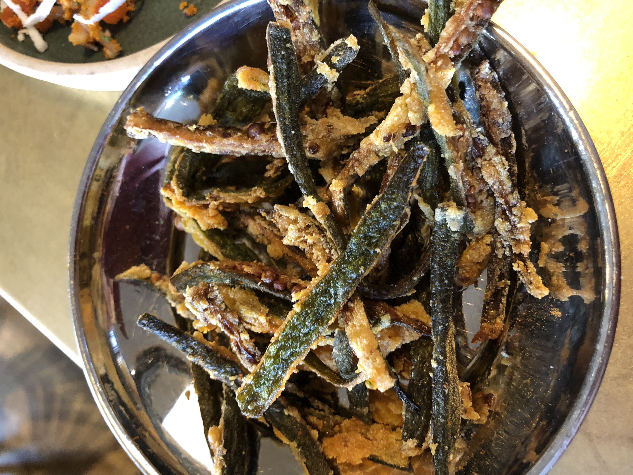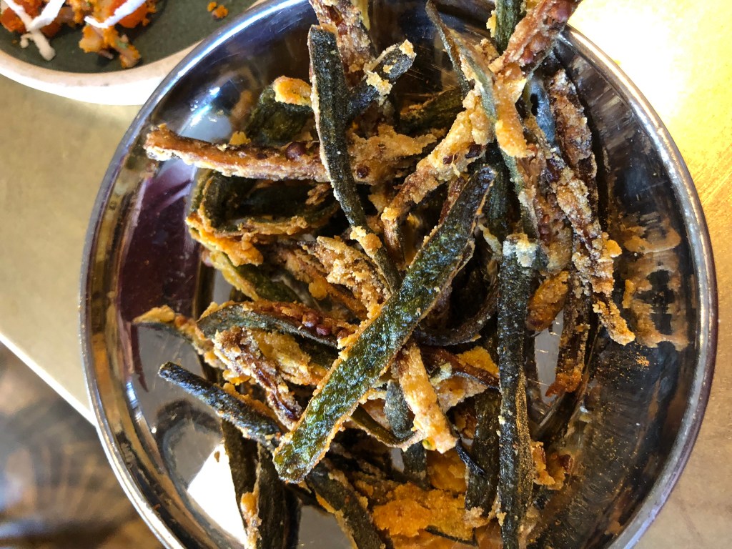 But the star of the show for me was the Kurkurit Bhindi – now I’ve done my research I see that kurkurit in various Indian languages means “crispy” or “crunchy”, and with my first mouthful of it I realised what had been wrong with most of the okra I’ve tried before. It’s one of those vegetables I’ve tried very hard to like; it’s common in many cuisines that I enjoy, so I really SHOULD love it. But somehow there is always an element of sliminess to it, a feeling of “oh my goodness did someone just swap in a baby slug instead of that green vegetable I thought I was eating”.