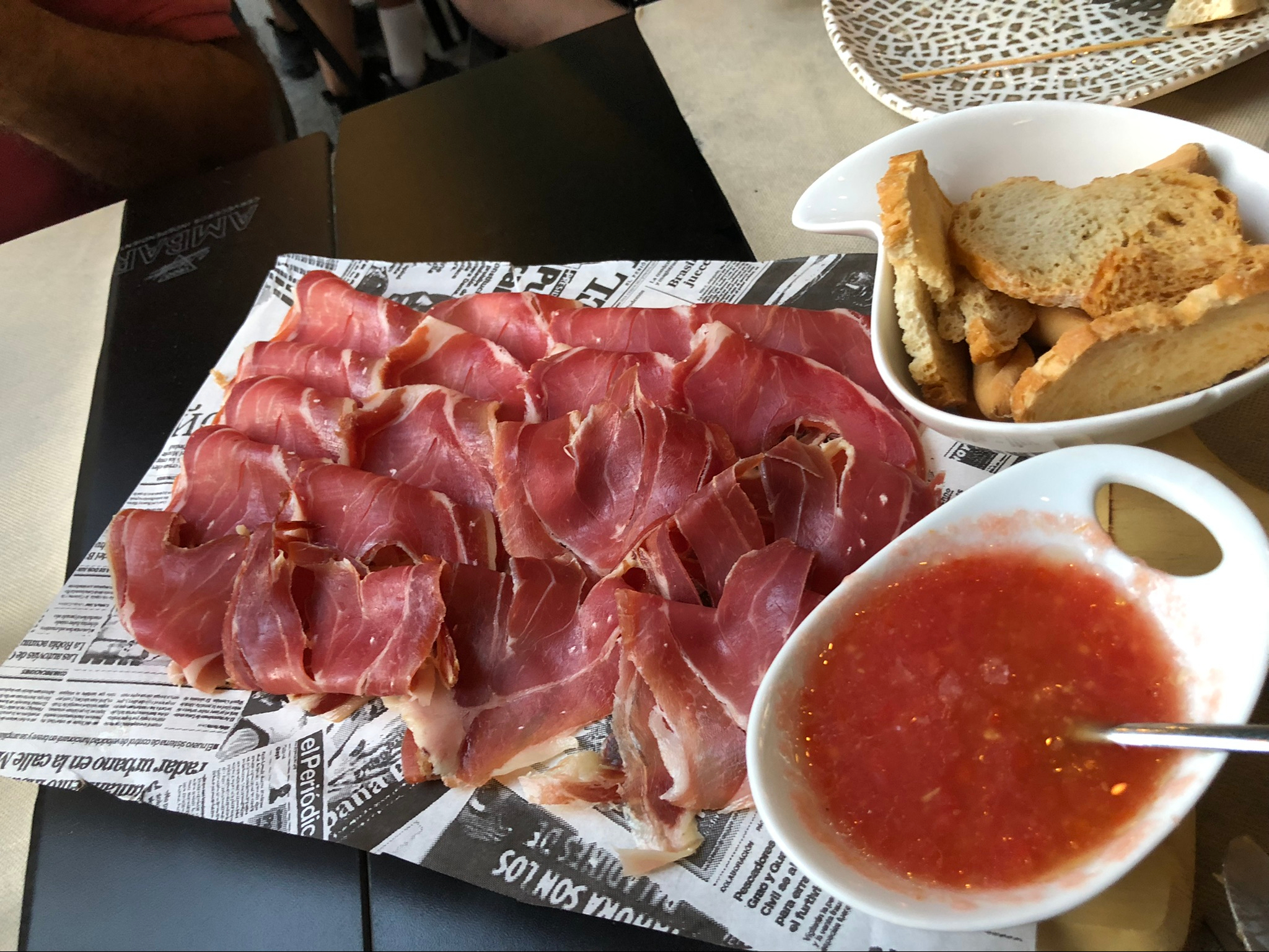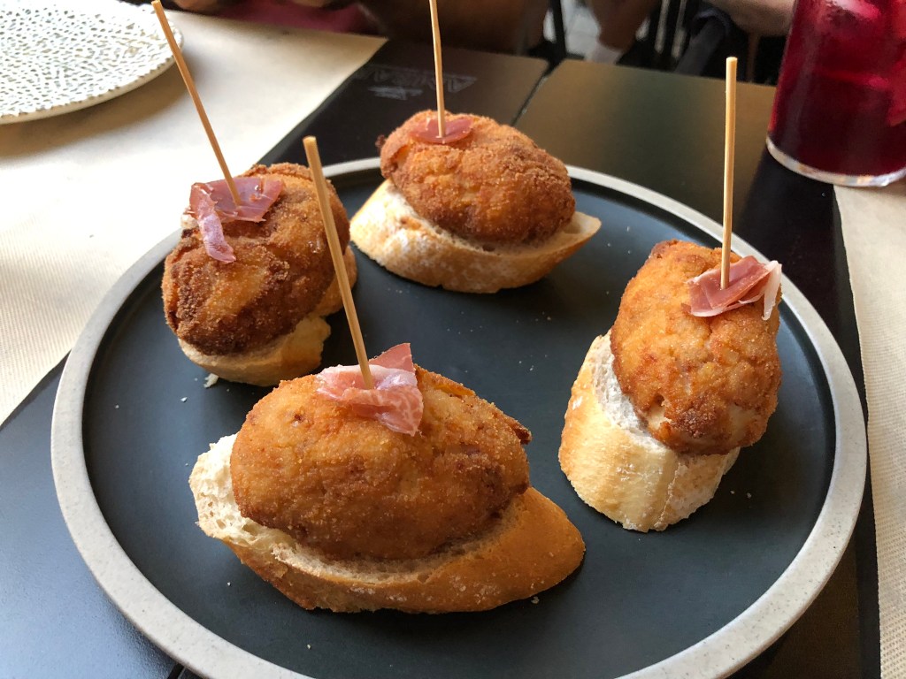 … they don’t come out well in a photo I suppose, but they were probably the most delicious croquetas I’ve had in Spain. I’m not really sure why they needed to produce them as “pintxos” on a slice of bread, but I suppose that puts them on a little stage and they are definitely stars – crispy on the outside but light and beautifully-flavoured on the inside. The jamón we had was also excellent, and prettily presented: