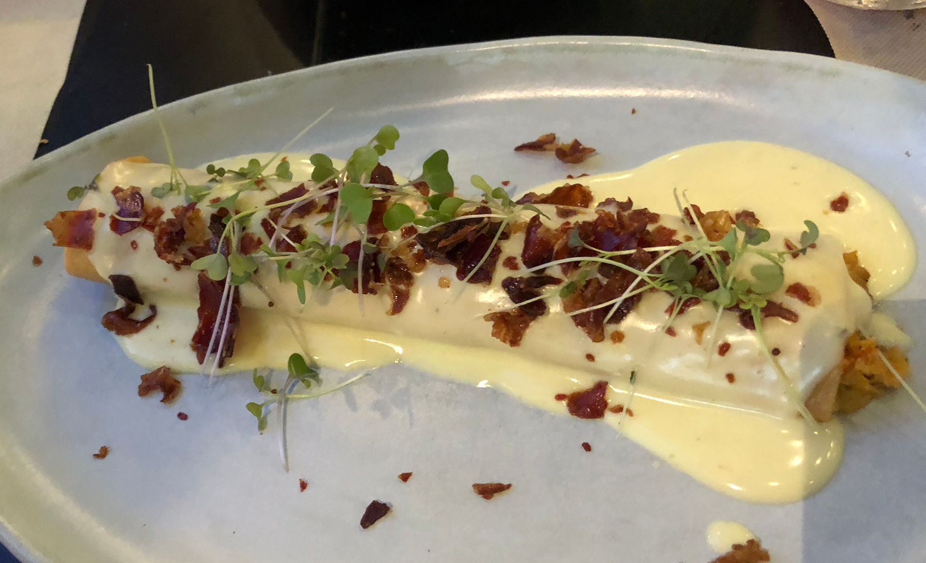 Another Aragonese dish that Rubén García has brought with a bang into the sophisticated world of 21st century tapas is the traditional chicken chilindrón. Chilindrón is a country chicken stew in which the sauce of tomato, chorizo, pepper and herbs has been slow-cooked to refine and intensify the flavours – like many of the best recipes, it sounds a lot simpler than it tastes, and here Mr García has put it into a tube of cannelloni surrounded by a saffron bechamel sauce so light it’s cloud-like.