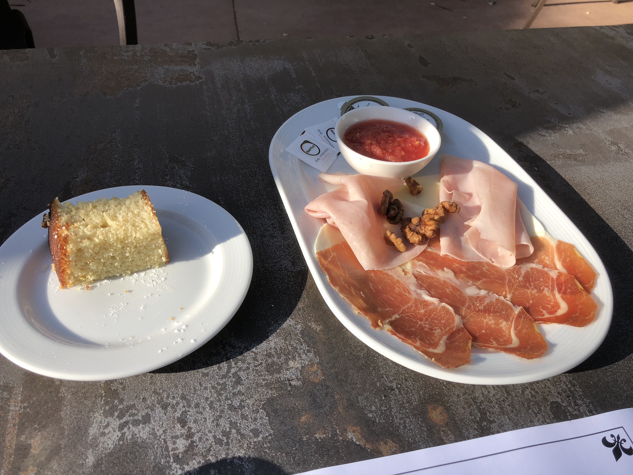 Rant over – I shouldn’t really be starting with the breakfast, but since I have I’d like to put on record now that it was generous and delicious, including both Spanish and “English” ham, slices of cheese, some home-made cake and (my favourite breakfast) grated tomato and tiny pots of olive oil for putting on a massive slab of toasted local bread. Oh and it was served in the garden.