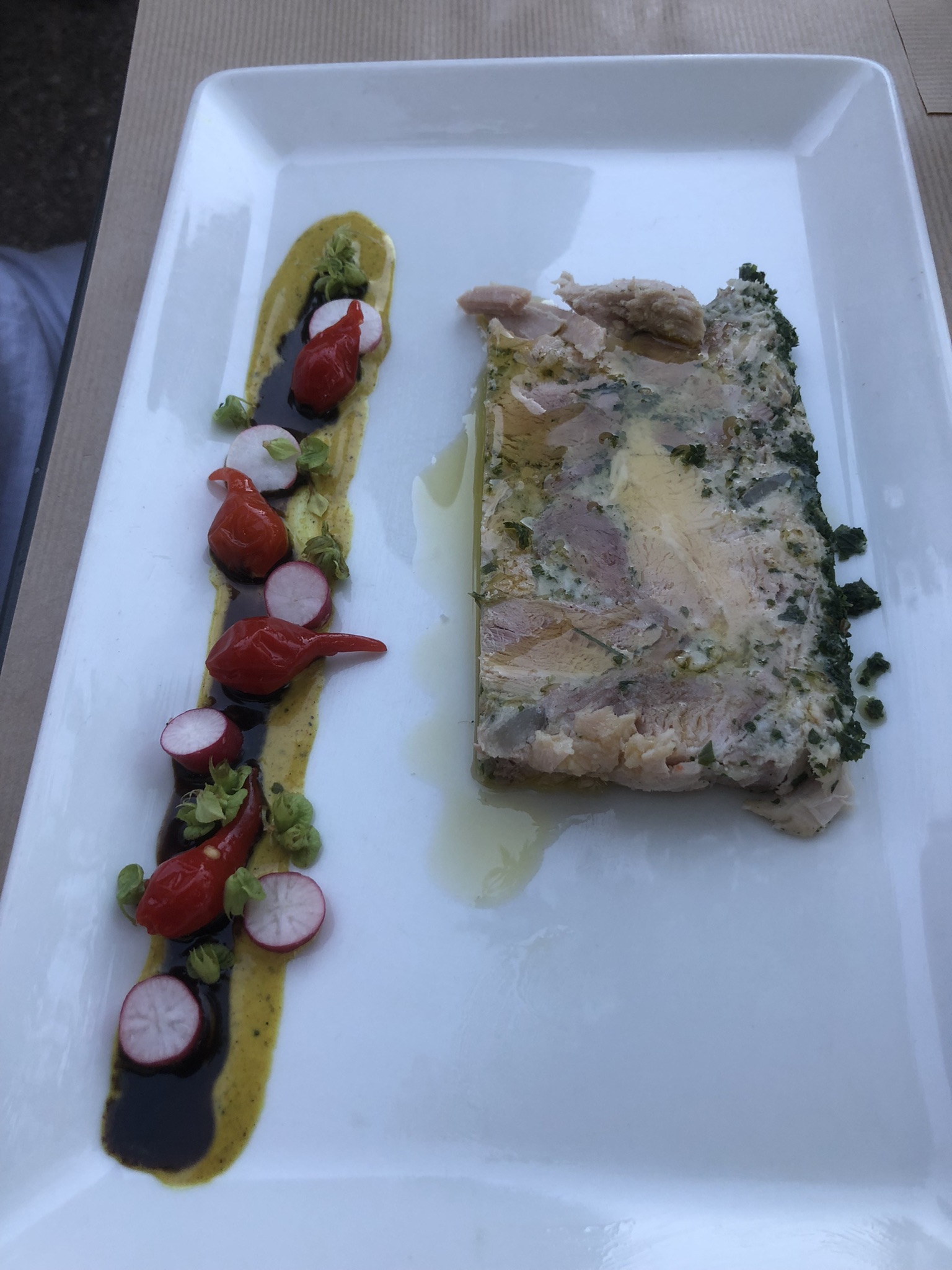 Golly wow. We were impressed, all thoughts of weeping and being reckless now very far indeed from our minds. The jambon persillé was superb, the dressing splurged alongside it adding a suspicion of curry to the fine and intensely-flavoured ham…..