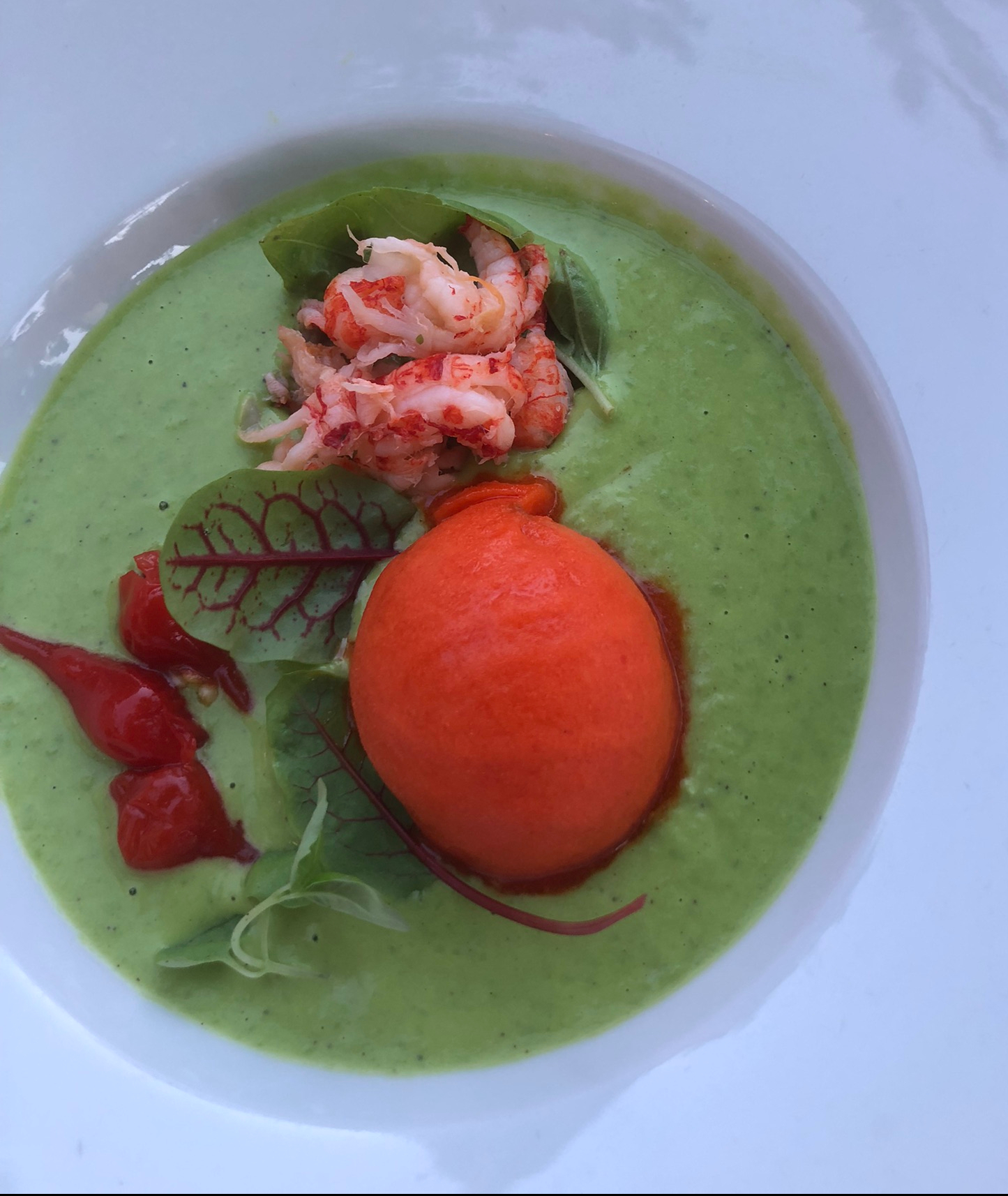 And the gazpacho of peas with shrimps LOOKED dramatic with its lovely light green set off by the vibrant red of the sorbet….