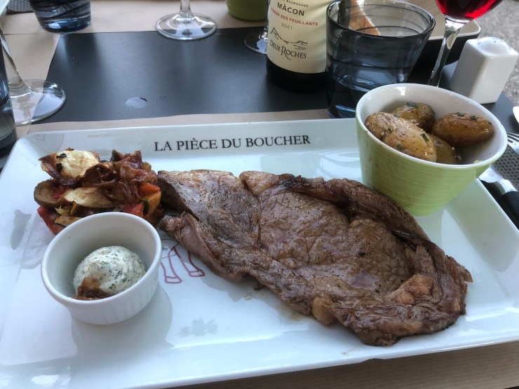 Now were I a braver person I might just have sent it back, but I felt on the back foot being English (would they take any notice of an English person on this matter? Doubtful), rather ignorant on the subject of steak generally, and it also seemed to me that you can send back an undercooked steak to be cooked a little more, but you can’t un-cook something so it would be a terrible waste. I’m just making excuses of course, I wasn’t brave enough to send it back and that’s an end to it. A French person would have demanded a new, properly cooked, steak, would probably have raised their voice if refused it, and would not have rested until it had arrived. Sigh. I’m just an English wimp.