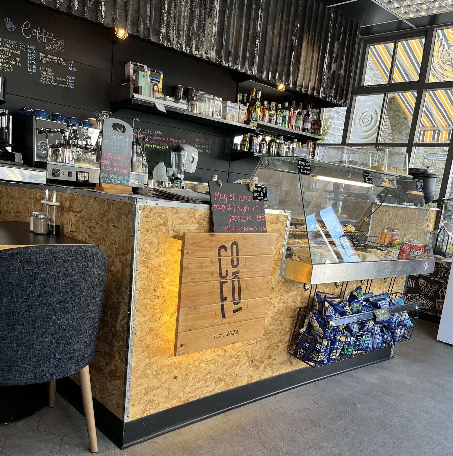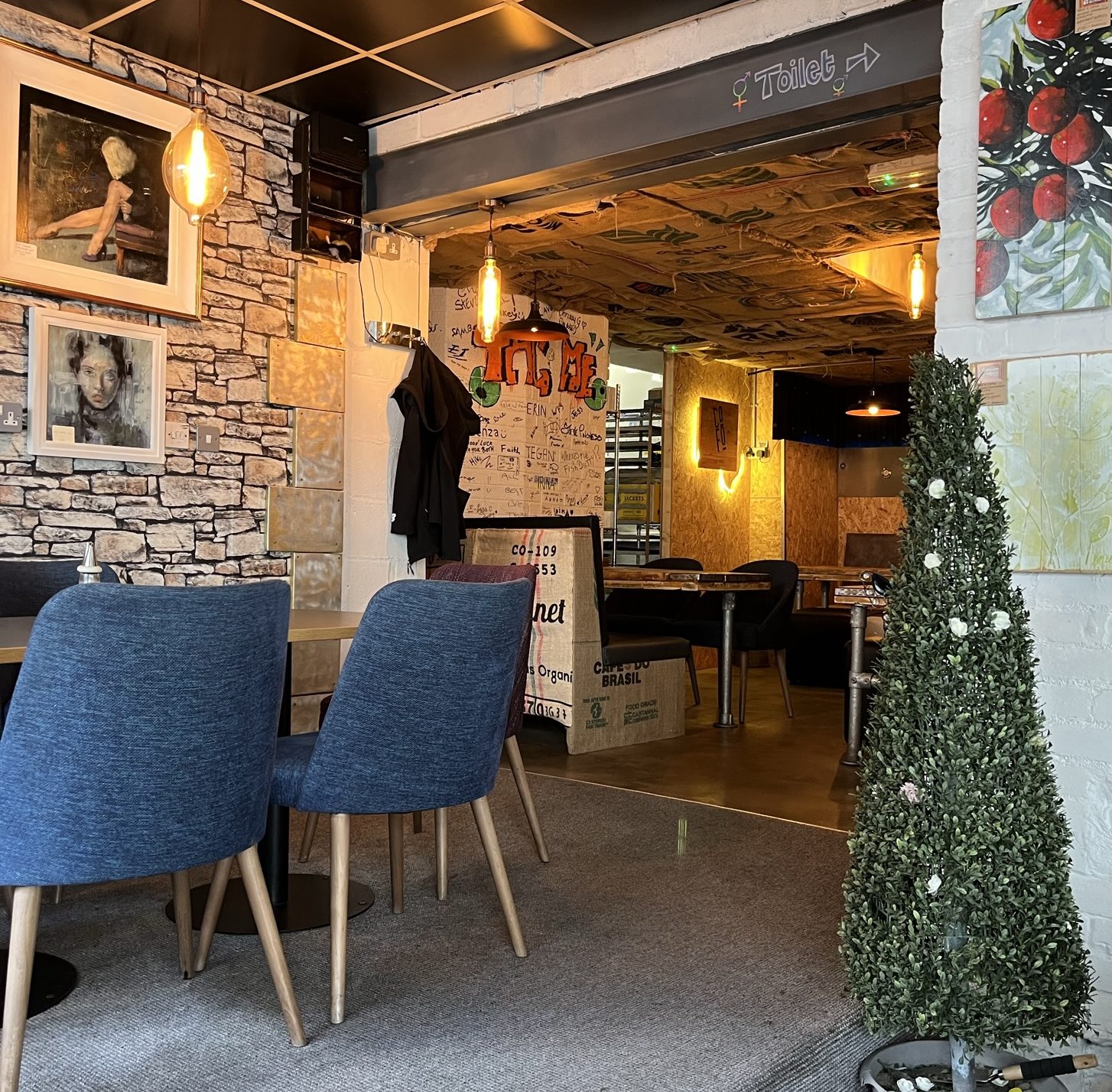 It’s original, quirky and welcoming, and raises an appreciative smile. I loved the use of coffee sacks and cardboard, and the home-made tables using what look like old doors and scaffolding poles. And yet there are also one or two corners of this quite small venue that use carpet, upholstered chairs and exposed brickwork for those for whom repurposed doors are a step too far.