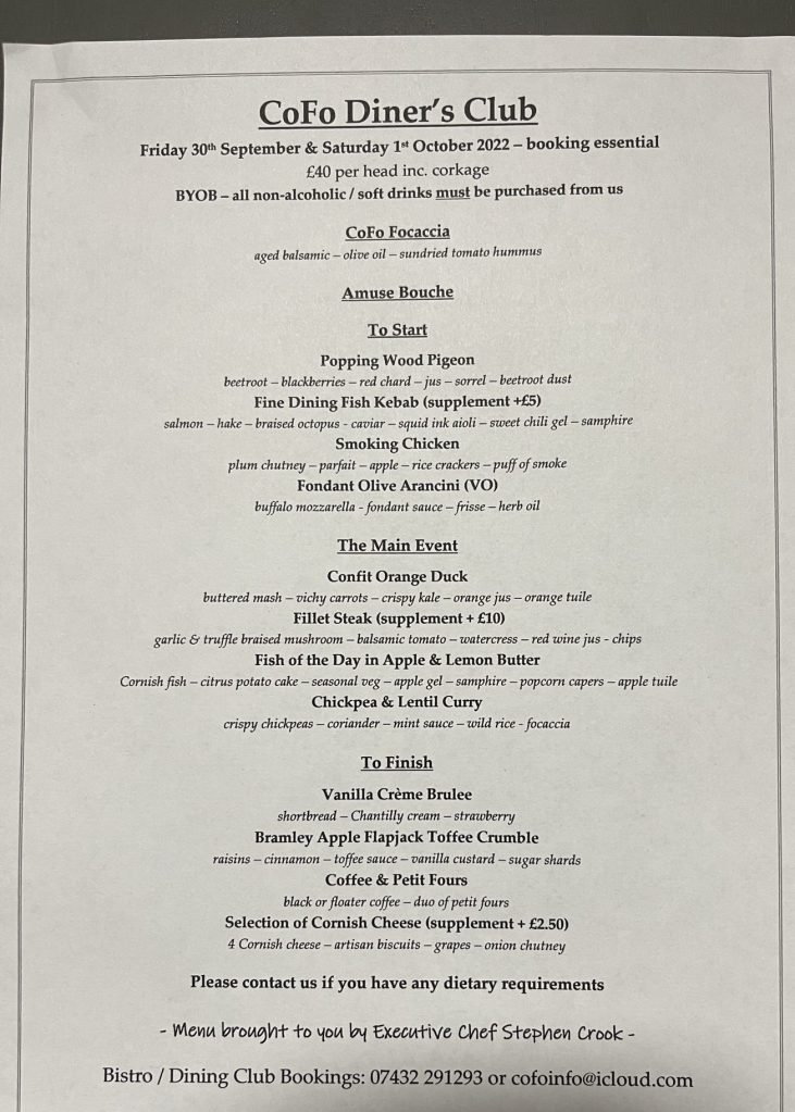 I have since discovered that the name CoFo is short for Cornish Foccacia, but what they offer is so much more than just that. I noticed a sign up advertising a Diner’s Club, and golly look at that menu…..