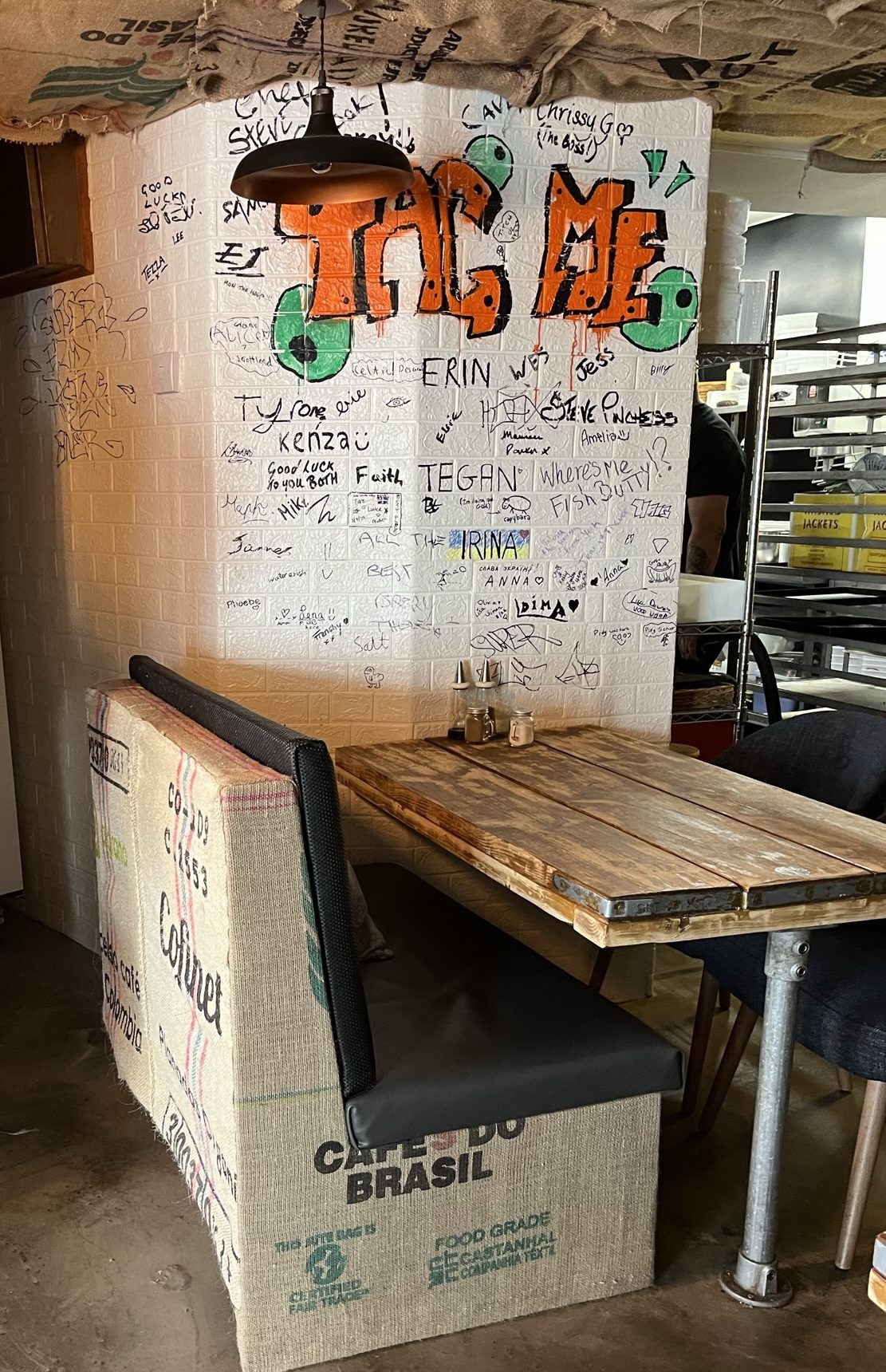 It was getting late for lunch so we pounced; the first thing we noticed on the way in was the décor, which I can only describe as pseudo-industrial favela-influenced clean utilitarian. (That would be a catchy slogan, wonder why they don’t use it?…)