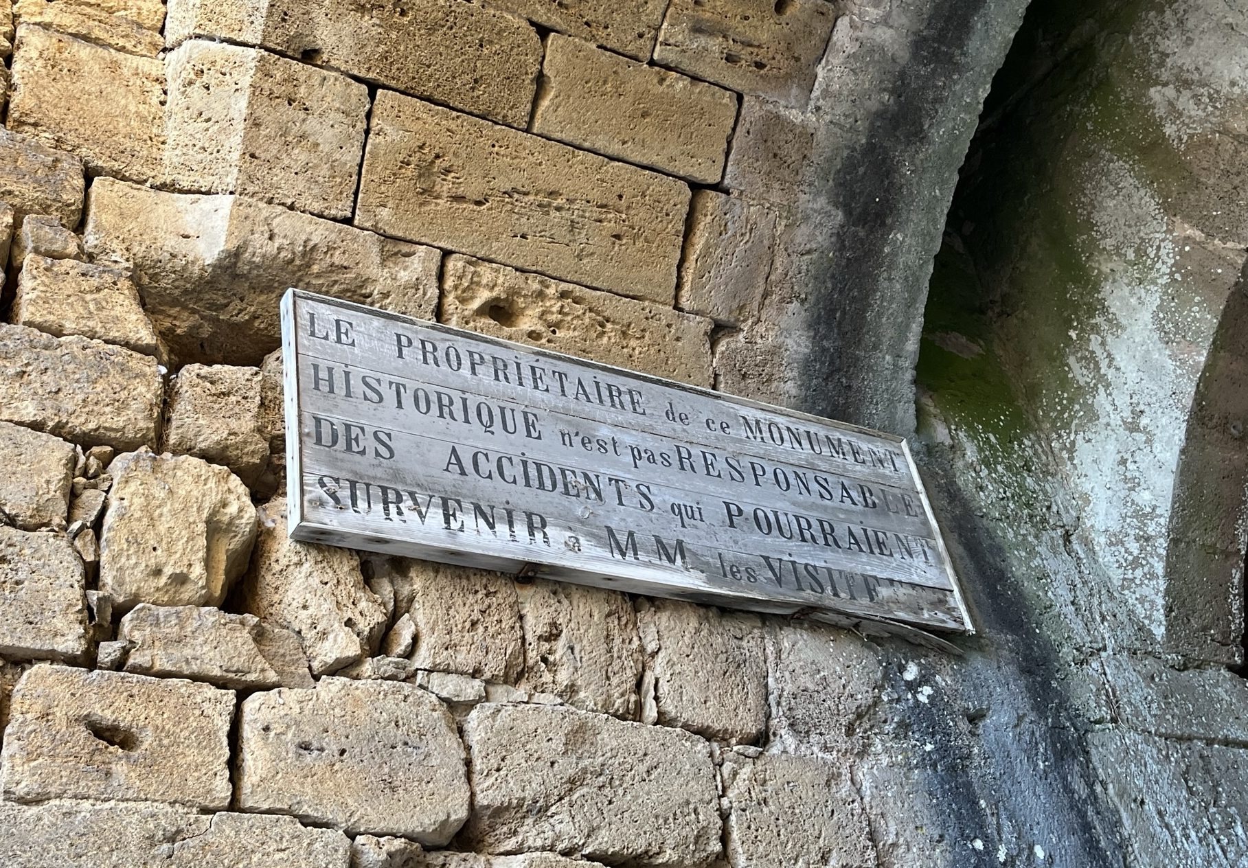 At some point in its more recent past one of the owners must have realised that stones may come tumbling down at any point causing traumatic events such as death to tourists, so they erected a warning sign – I love that the current owner, a businessman from Bordeaux, has kept the sign up despite it being faded and barely clinging to the damaged wall: