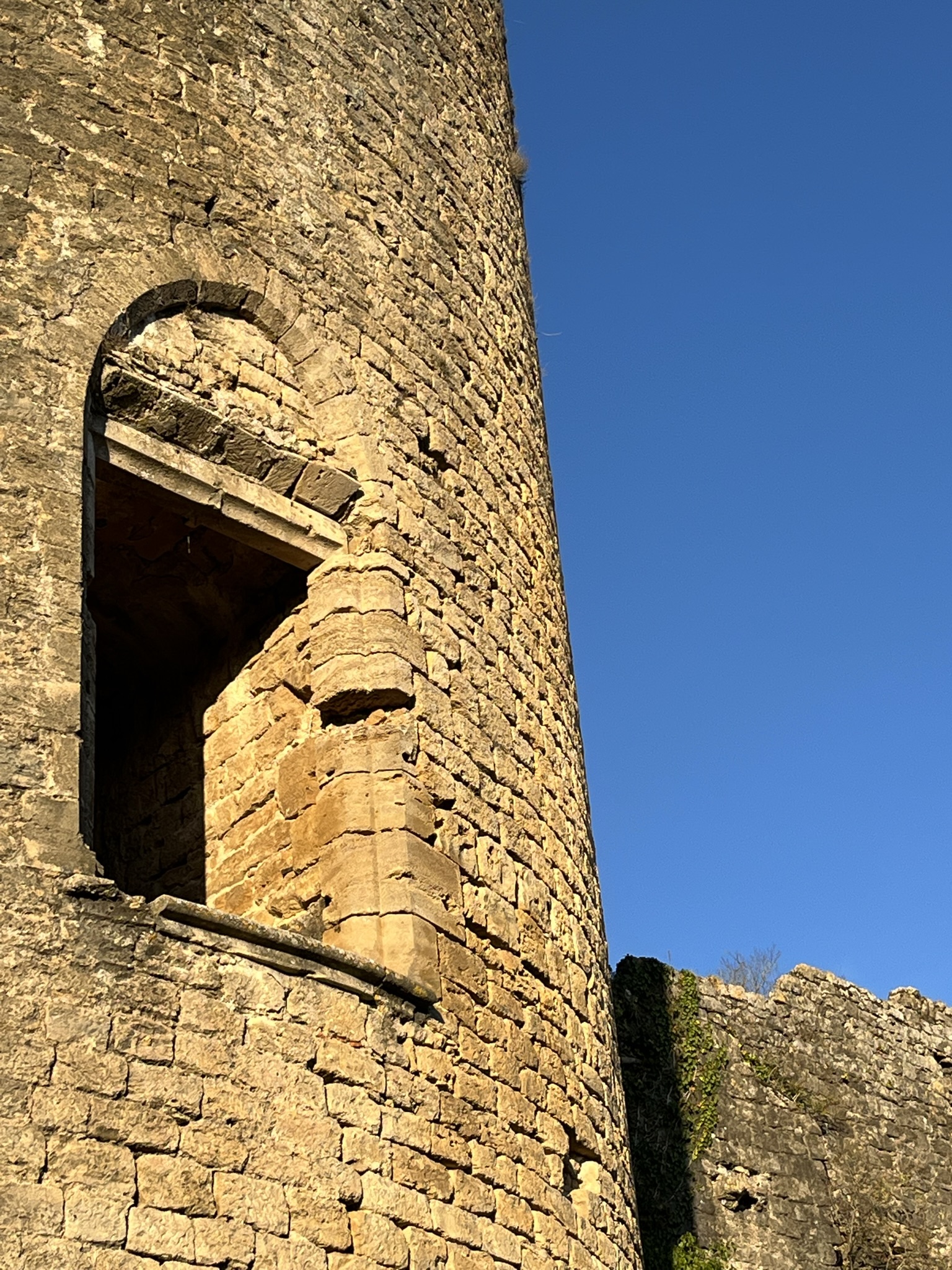 It’s now a ruin, but still looks like the kind of castle a child would draw – towers, crenellations, moat, and all in a beautifully-coloured local stone that glows yellowly in the morning and evening light.