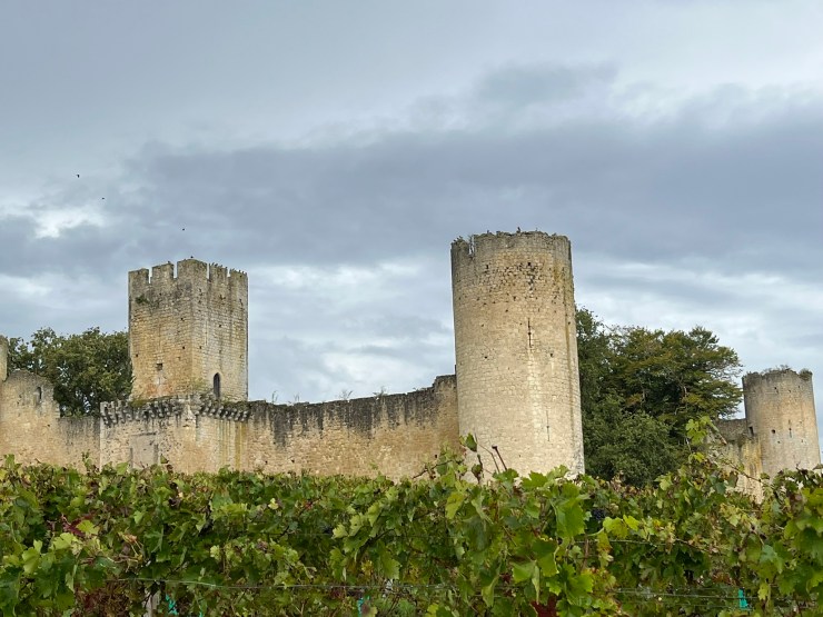 So we left Villandraut and headed on a minor detour to seek out some Graves wine from a producer at Château Budos; “château” doesn’t always mean “castle”, particularly where wine is involved, so when one loomed up behind the vines against what was now a backdrop of mountainous clouds in way more than fifty shades of grey it was impressive: