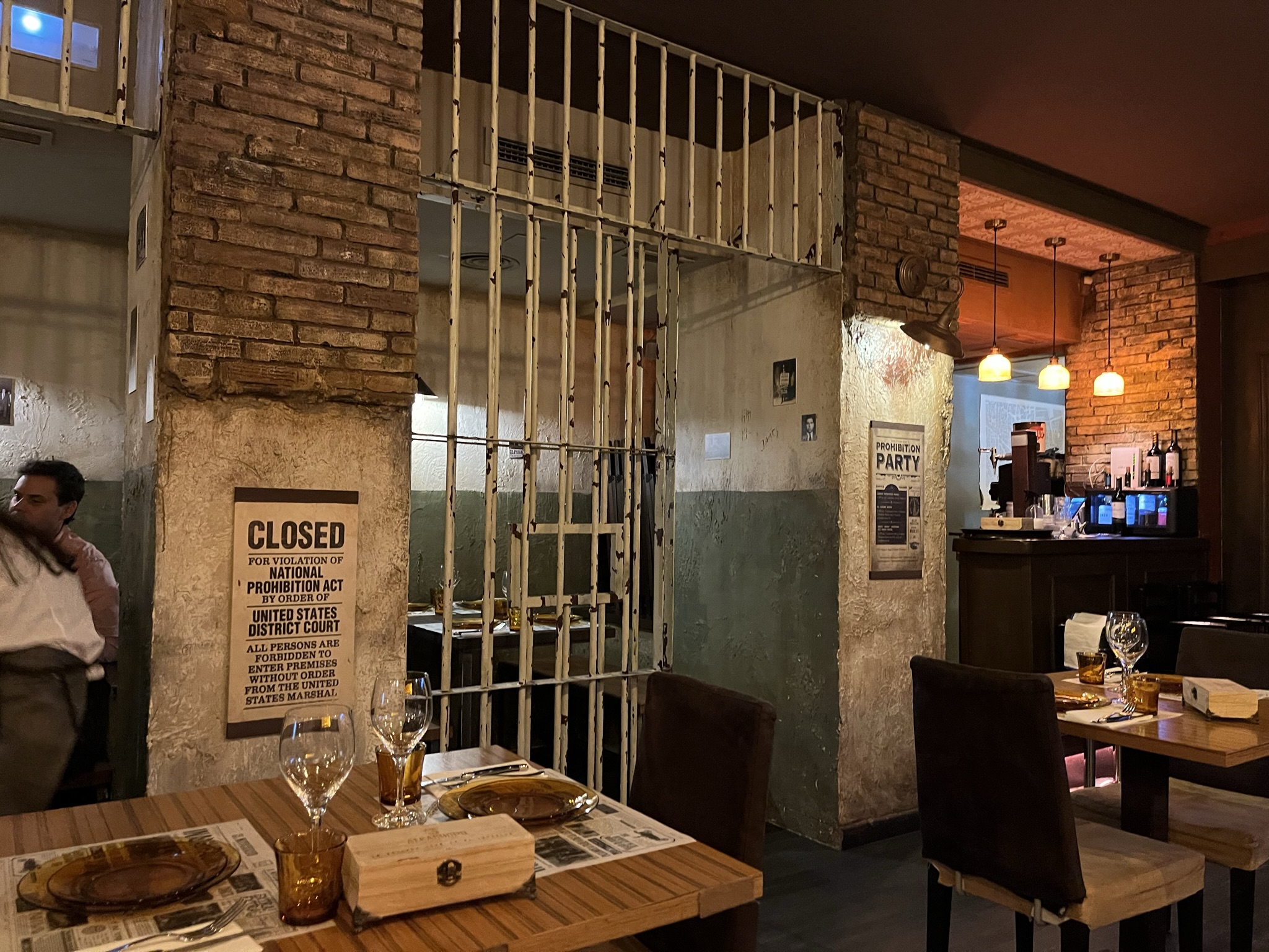 Once your reservation is confirmed, the receptionist presses a button and the shelves slide aside, speakeasy style, to let you in to the restaurant where suddenly you are in, er, Alcatraz?