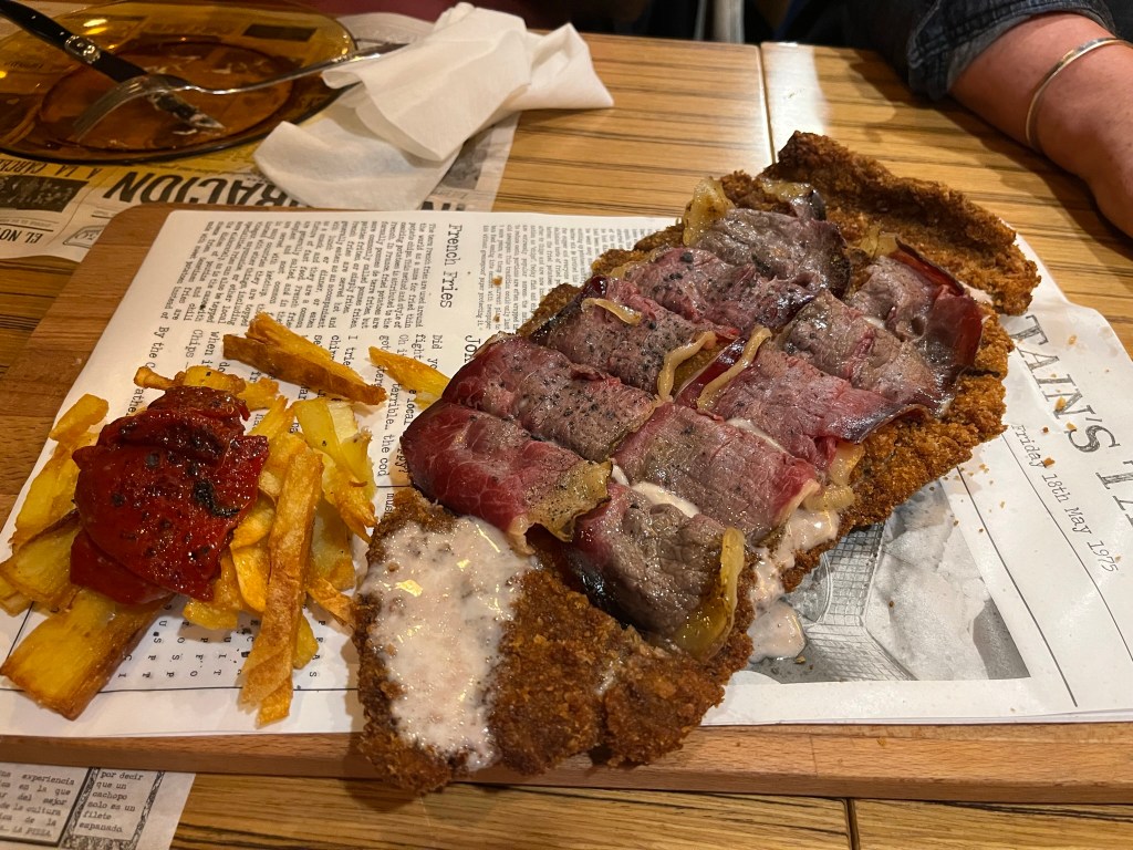 Before describing our cachopo adventure, I will do a quick encyclopaedia item on the cachopo, a food item that has become hugely popular across Spain in recent years. There are cachopo competitions and cachopo league tables, “best cachopo in Spain” awards, and little specialist cachopo bars breaking out all over the place…. It originated in the early 20th century in Asturias in the north of Spain, a beautiful region of rich grassy hills and mountains where beef cattle roam and the grass is as high as an elephant’s eye. The word “cachopo” started life as a word to describe a hollow tree trunk where woodsmen would keep their tools overnight, and then was borrowed to describe this dish whose exterior crisp breadcrumb coating encloses two thin slices of beef with serrano ham and Asturian cheese between them. The whole thing is then cooked, usually fried, and served with chips and salad. (For those who are intimate with Spanish cuisine, cachopo fans insist indignantly that a cachopo is COMPLETELY different from a San Jacobo and a Flamenquín.) (For those NOT intimate with Spanish cuisine, don’t worry – it’s all a bit niche.)