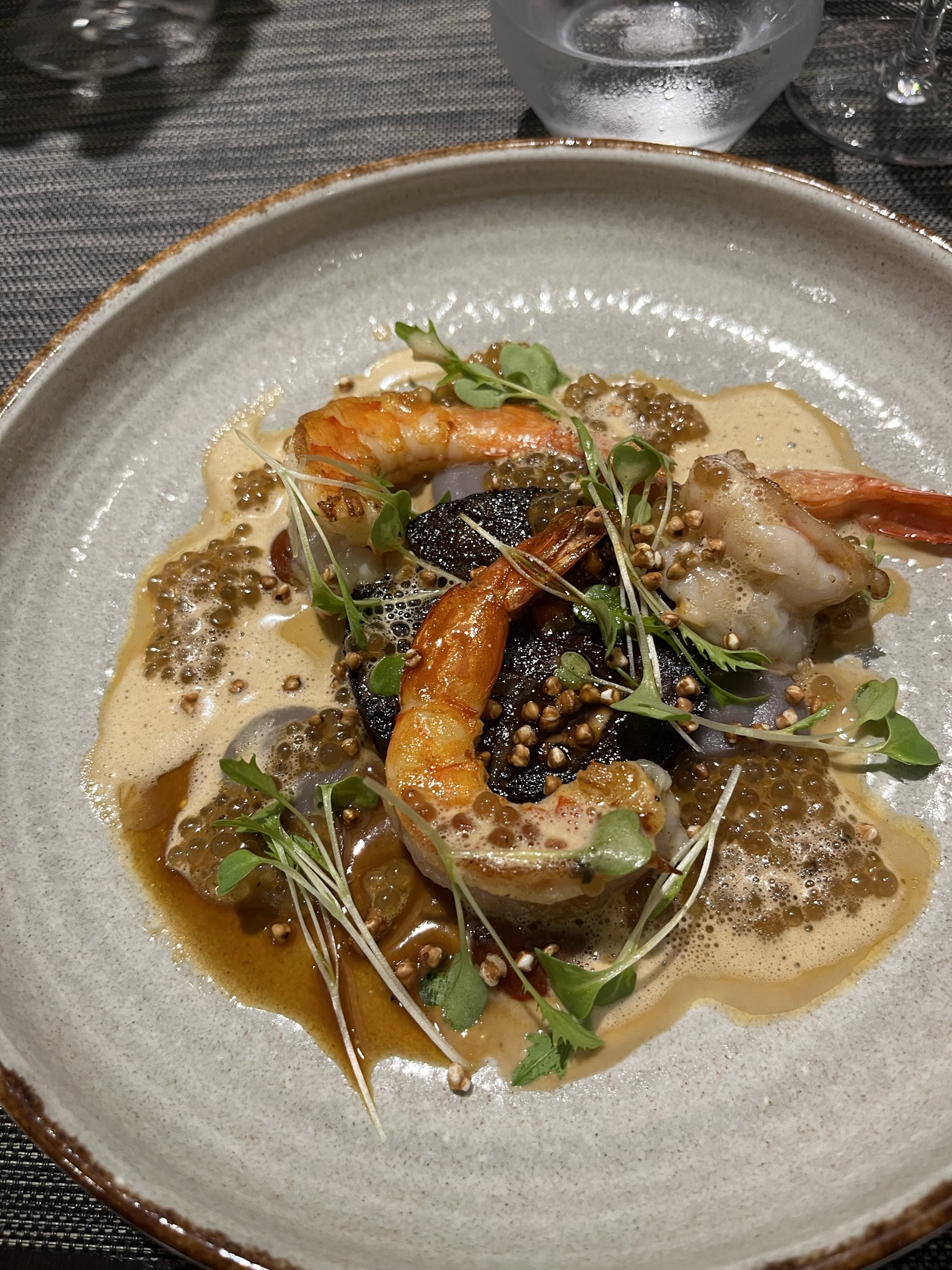 We both chose the boudin and gambas starter, with a crème de crustacées and the sweetly-named “perles du japon” (i.e. tapioca). The main ingredients were perfectly cooked, but the star of the dish for me was the crustacean cream, an intensely-flavoured liquid that tripped happily around all the other flavours, balancing them out and enhancing them.