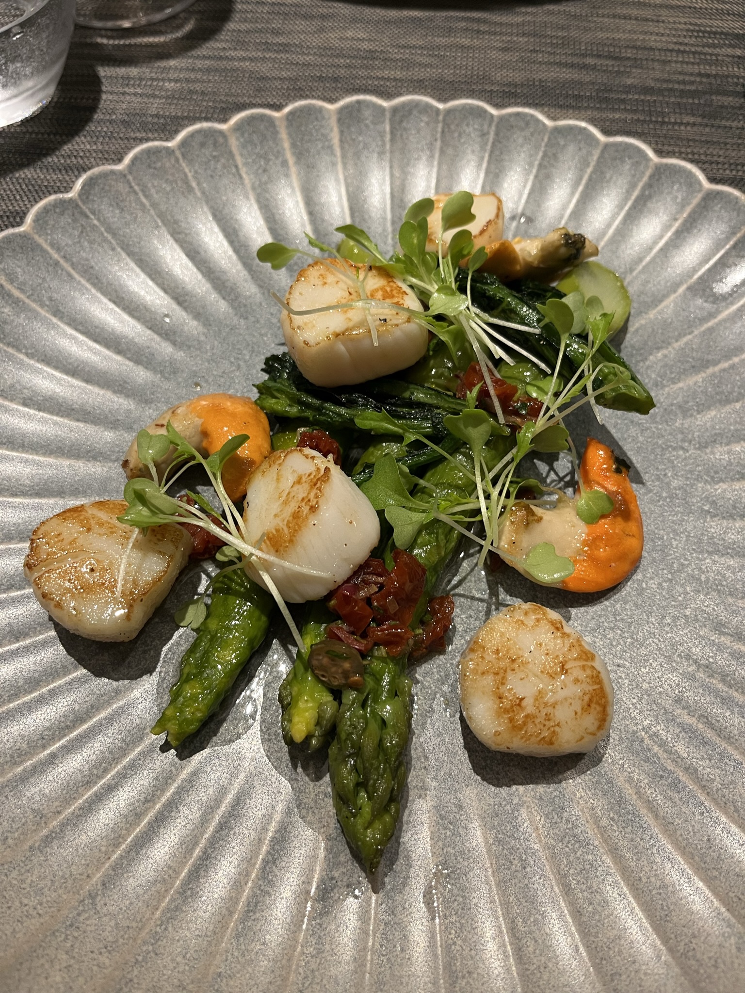 Leaving the philosophy aside, our other main dish was the really delicious scallops “snackées” with green asparagus, and shreds of dried tomato garnished with capers and artichokes. The word “snacker” is one of many examples of English being repurposed into French – once in the language of Molière it acquires the meaning of “seared” or even just “blowtorched”, in other words blasted with extreme heat on the outside leaving the inside nearly uncooked. Who cares, the result is truly delicious.