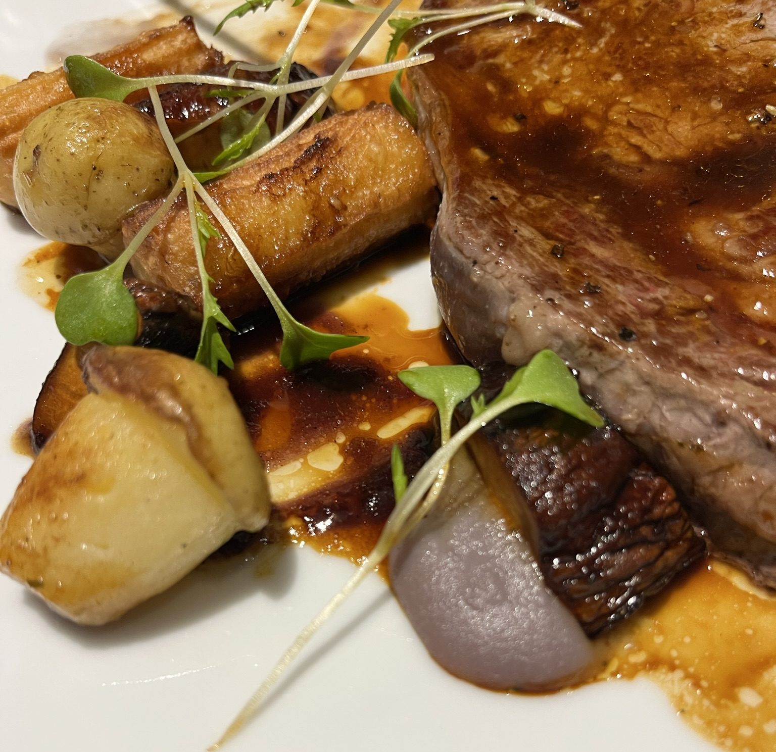 As main dishes one of us had an entrecôte steak with another intense gravy and Noirmoutier potatoes on the side, prepared so as to look like fluffy acorns, and one tiny turnip chuckling quietly in a little puddle of jus.