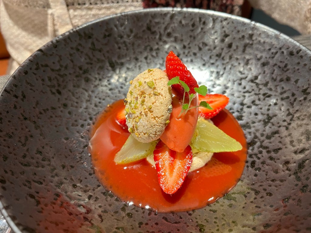 Having initially taken the decision to eschew pudding we changed our minds with not a backwards thought, and oh yes that was the right decision. One hot passion fruit soufflé (with caramel and lime ice cream) and pistachio macaron (with local strawberries and rhubarb compote flavoured with hibiscus) later we were truly replete without actually being in a food coma. The passion fruit soufflé in particular was a masterpiece of lightness with bursting flavour.
