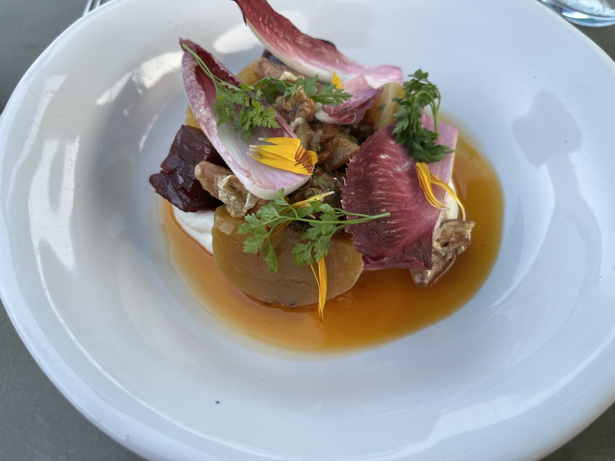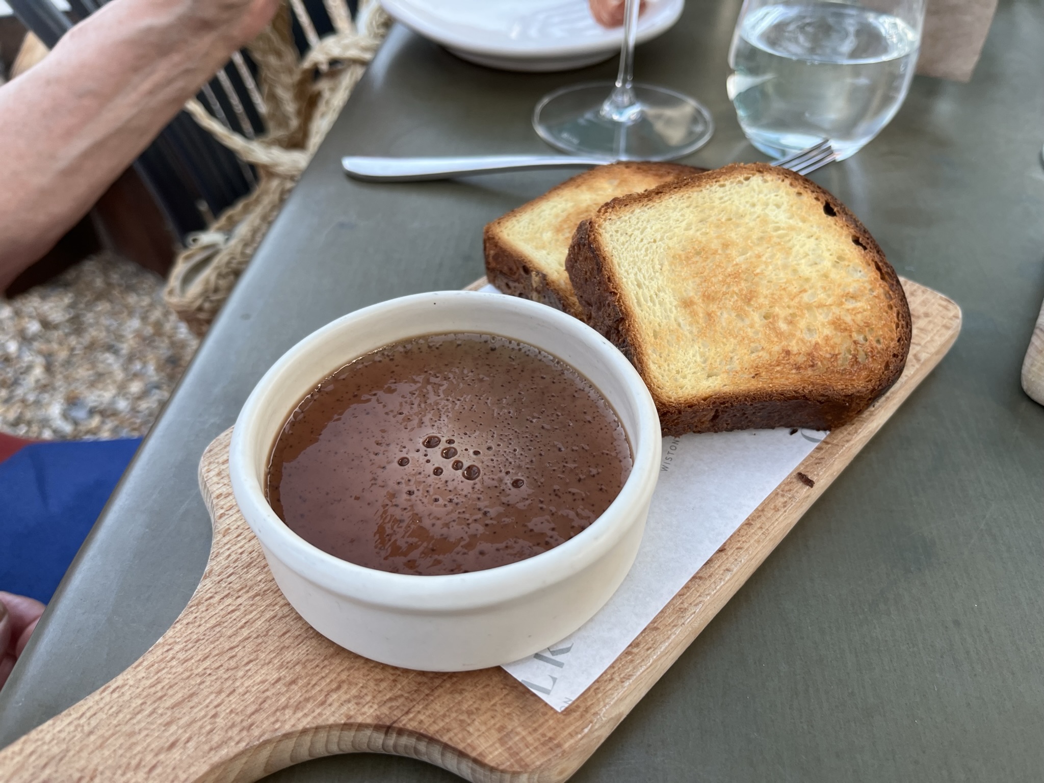 The quantities of all dishes were exactly right, and it had taken thought and skill to put them all together. We were also sitting in really civilised surroundings on a relaxingly warm summer’s evening and sipping a truly pleasurable wine. I did say it was just a “slight quibble”.