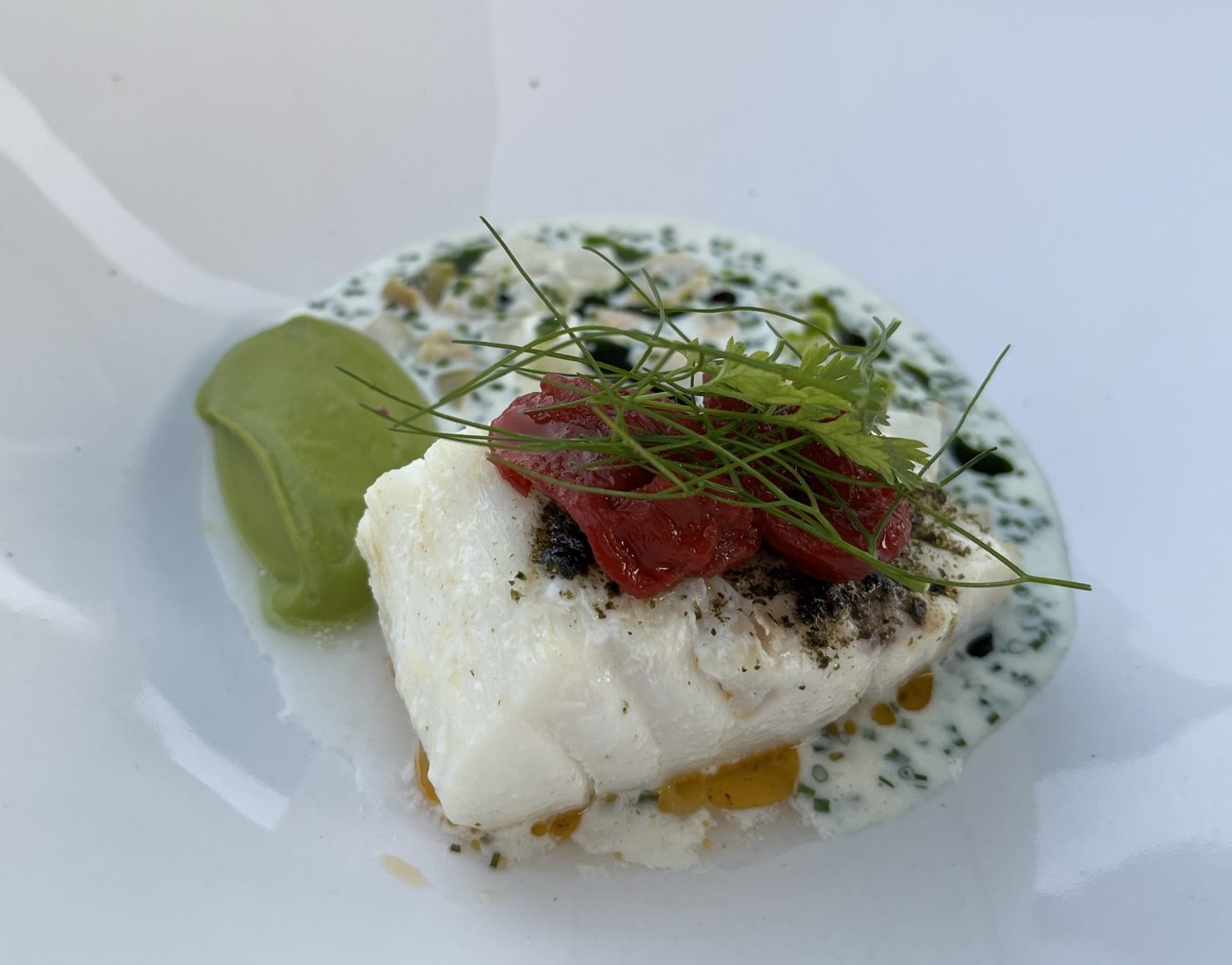For our main courses – again, like the starters, from a choice of just 4 dishes – we had butter poached cod, confit tomato, Gordal olive and courgette/basil purée of a striking fresh green colour and zingy taste: