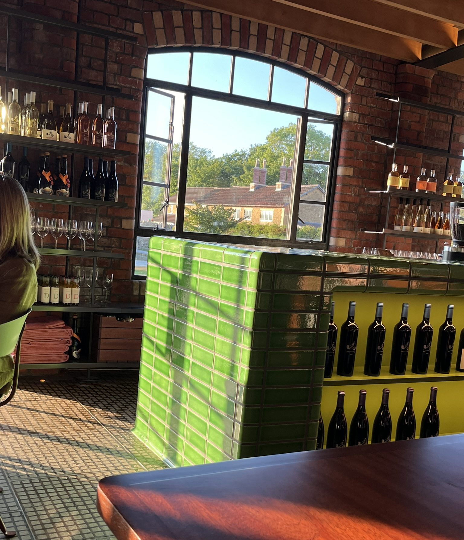 Everywhere you turn there are those really solid Victorian/Edwardian industrial curved lines, in brick or tile or wood. Look at the window, the corners of the green-tiled bar and the table…..