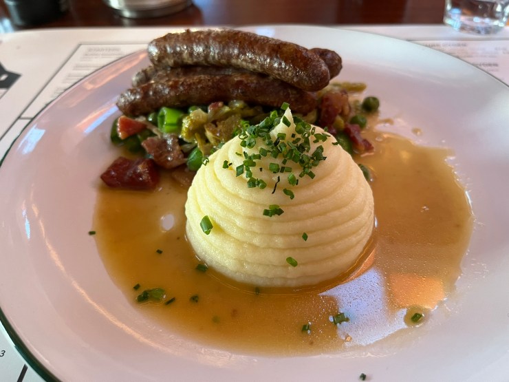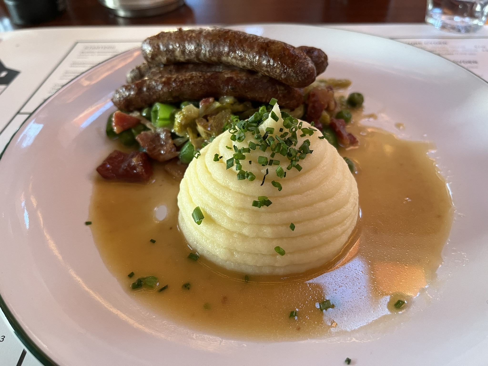 Other items on the menu include “Lloyd’s lamb merguez sausages” – these are nice sausages, especially if you like salt and are not expecting spicy merguez sausages like the ones you buy in France. The mashed potato that comes with them is superb, and beautifully presented in an architectural spiral (more curves).