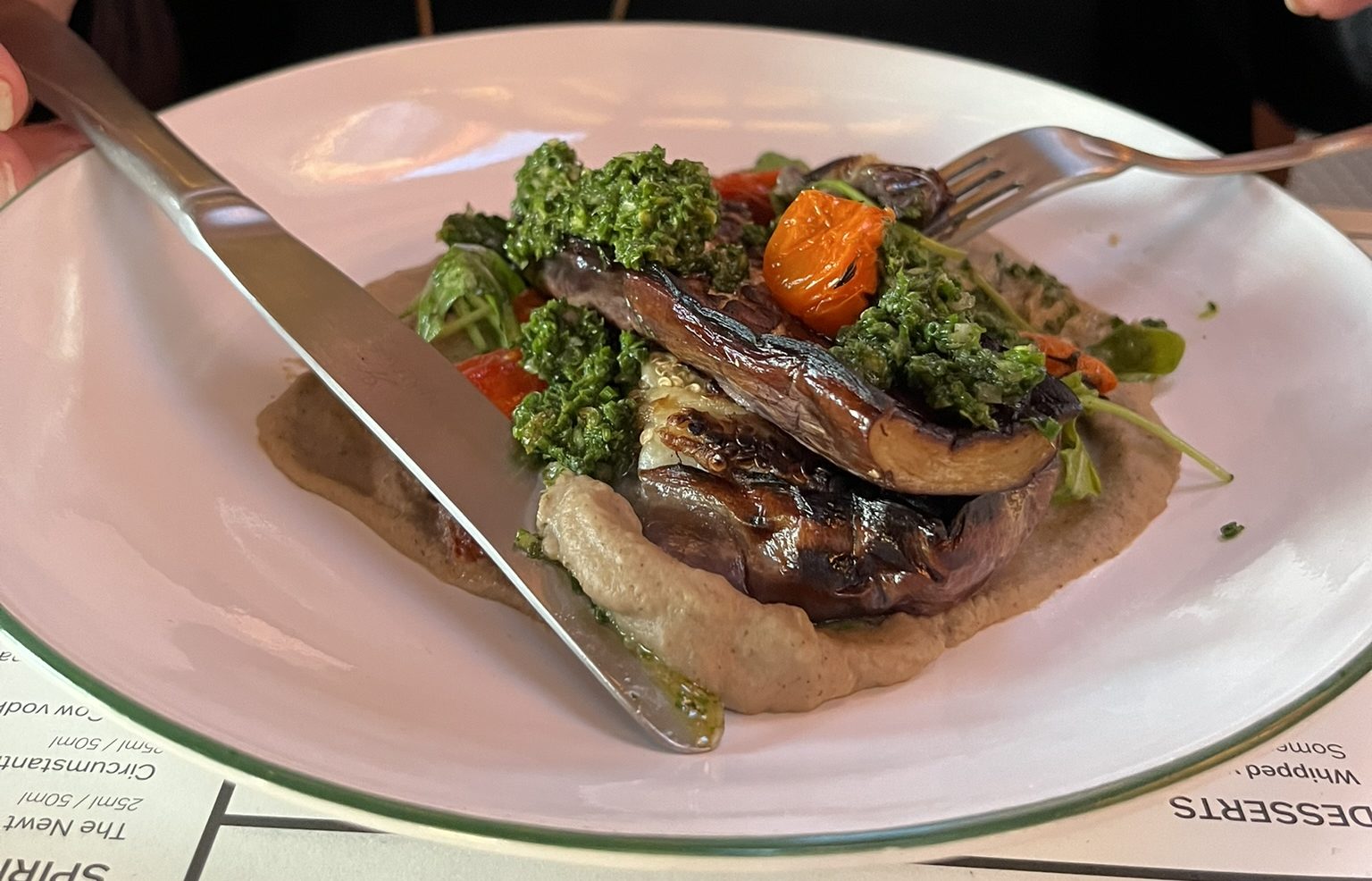 The vegetarian / vegan option was roasted smoked aubergine with tomato and flaked almonds, with seasonal vegetables, and there was nothing exactly wrong with it but it was not substantial in either quantity or flavour.
