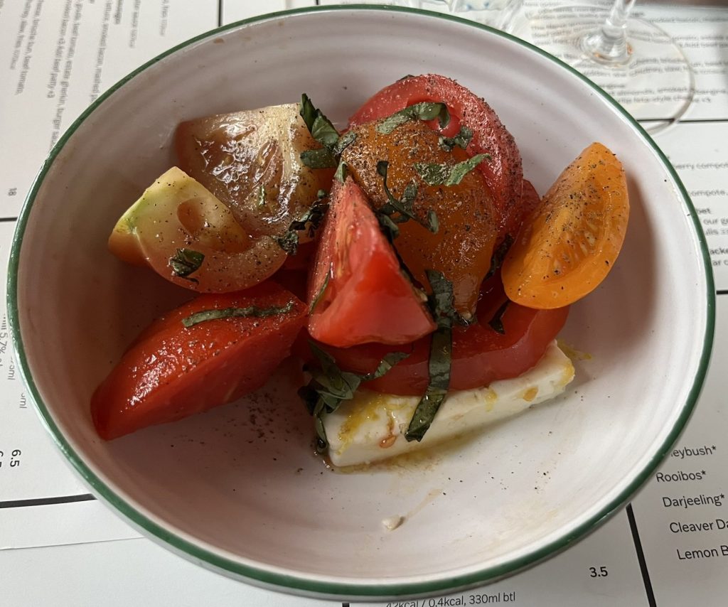 Among the starters, the Newt-produced mozzarella was good, with a nice olive oil from the Newt’s sister establishment Babylonstoren in South Africa, and the glasshouse tomatoes from the Newt with waterlip cheese (a little like feta) were delicious.