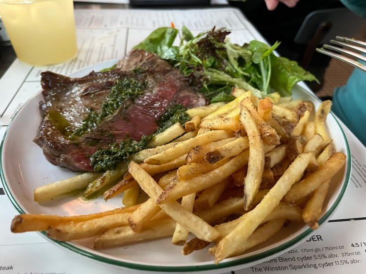Let me take you through this particular dish. The steak on the menu is described as “butcher’s cut”, so you don’t know which actual cut it is; fair enough, you think, this bills itself as a “station bistro”, not a Michelin-starred venue. When the steak arrives there is an initial moment of excitement because it actually looks the right colour for rare or medium rare, rather than the cremated offerings one is so often served in England. (“Rare steak, Madam? Yes of course – I’ll be back in an hour or so once chef has finished burning it to a crisp.”)
