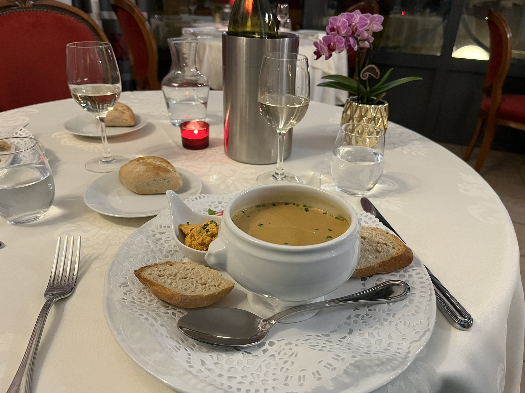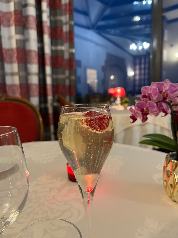 So we happily settled ourselves at the restaurant’s best table, and accepted the charming lady’s suggestion of an aperitif that she said she had developed for Valentine’s day, a sparkling wine with a shot of Calvados and a fresh raspberry, rather like a kir normand but without the cassis. We then studied the menu, sipping our aperitif and surrounded by glass and multiple reflections of candles while listening to the muted but roaring wind outside and hearing the waves crash onto the sea wall just metres from our table. It was a delightfully relaxing way to start a meal.