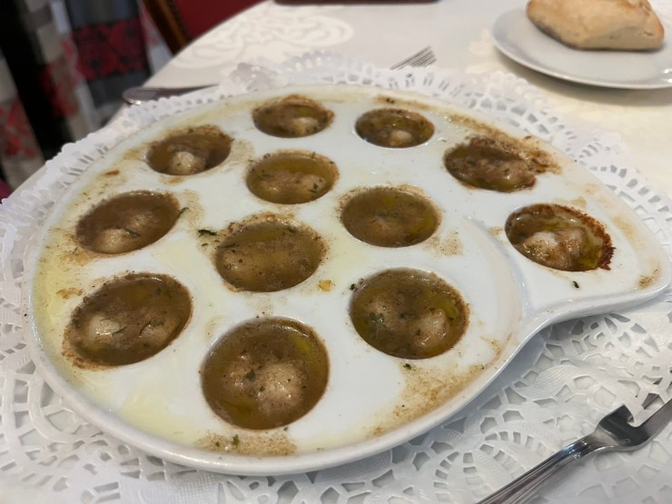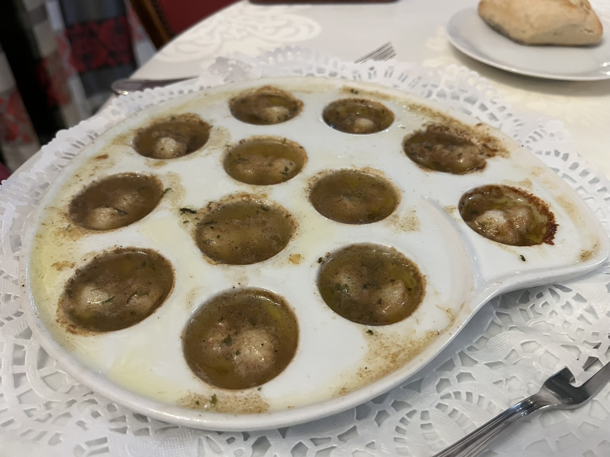 And our other starter choice was the “pétoncles”, or queen scallops. These are a little smaller than the scallops that are usually served in restaurants, and here they were served in a snail dish with lashings of garlic butter. The slightly unexpected sweetness of these smaller scallops is complemented perfectly by garlic butter (isn’t everything? I hear you mutter…)