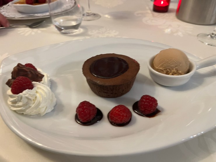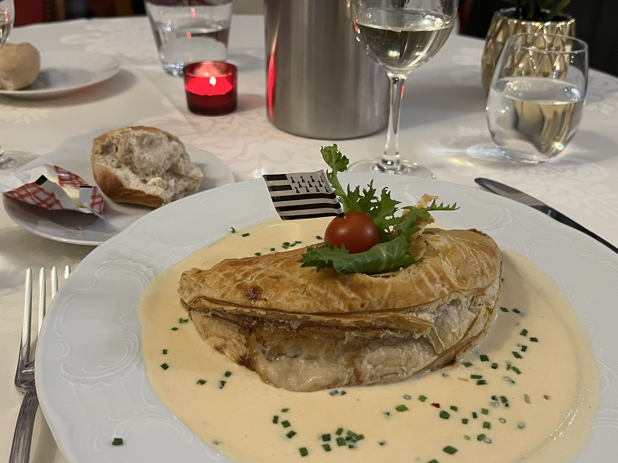 When you’re in Brittany it makes sense to stick with produce from the sea, so we both chose the same main course which was Saint Jacques scallops served inside puff pastry with shrimps in a creamy sauce seasoned with espelette pepper. The little Breton flag thrust into it obviously added extra spice to the flavour, and the Quincy wine we had chosen went particularly well with it.