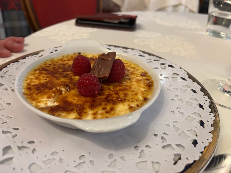 Both were tasty, although this was my first time with a moelleux au chocolat that appeared to have had the chocolate sauce poured in to the cake part, presumably having drilled a hole for it first? Unusual, and not an improvement on how it’s usually done, but the flavour was good. The crème brulée was excellent, if a little large. And there had clearly been a job lot of raspberries delivered to the restaurant that week.