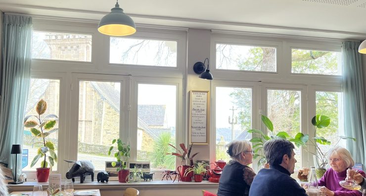 The interior is welcoming and bright, with exposed stone walls and big windows opening on to the ancient tree and an even more ancient church, much of which dates from the 10th century, and in the distance the sparkling waters of the Bay of Morlaix.