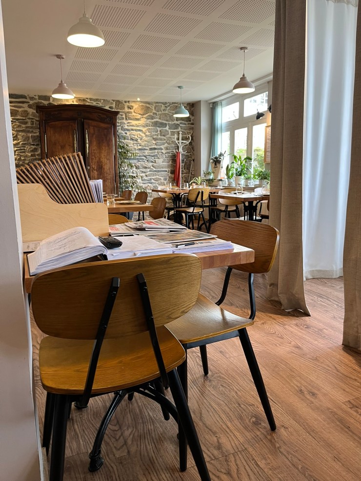 The restaurant is appealing from the outside, with its white walls and blue shutters, and pleasantly clean and bright on the inside. It’s owned by Christophe Guihot, who previously ran a well-known brasserie in Morlaix, and when he was younger worked with the Roux brothers in London, amongst other places. He created this restaurant on the ground floor of his and his wife’s house, and has chosen to make his restaurant as sustainable as possible, getting his restaurant certified by the French organisation “Écotable” which keeps a register of sustainable businesses based on criteria ranging from how local the ingredients are to how ecological the cleaning régime is.