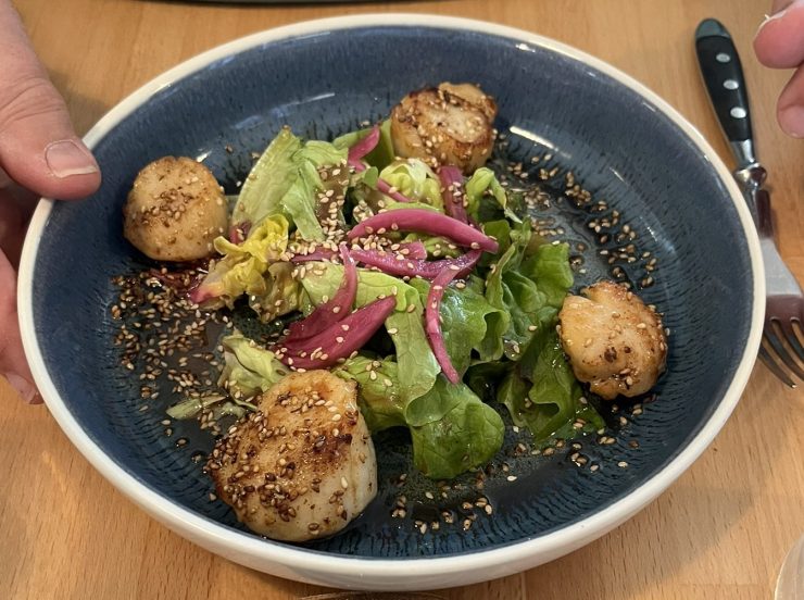One of our starters was the scallops with sesame seeds to start with, with the omnipresent Roscoff onions – what a great combination of flavours. You could almost hear the onions whispering sweet nothings to the scallops, and the scallops blushing prettily and murmuring breathily “too kind, too kind”.