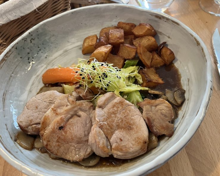 We were cheerfully shown to a table in this pleasant room with a quiet buzz of appreciative conversation from the other diners, and chose from a simple but unusual menu offering delights including oysters, charcuterie, scallops and sausages. I opted for the menu of the day , starting with bacon and lentil salad and then pork “piccata” – in other words, thin slices of meat in a sharp sauce.