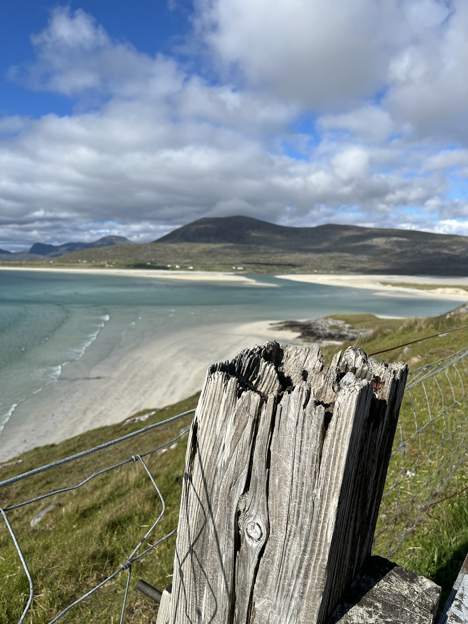 And round every bend in the road, it seemed, these panoramas of hills, water and white sand (oh and one rather photogenic fence post) spread out before us…