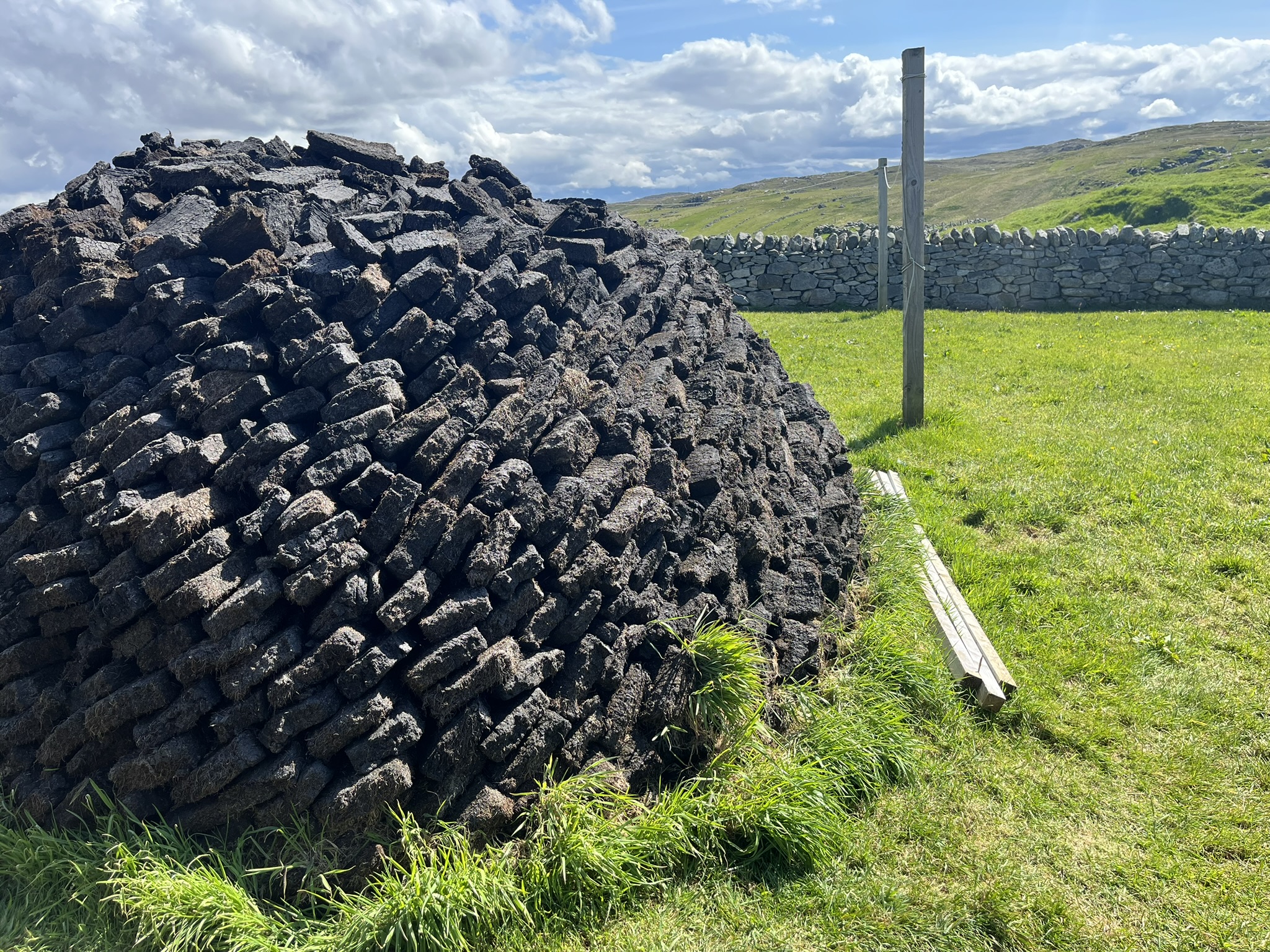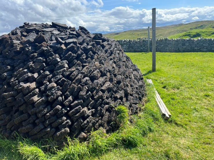 This was the view as we continued south on Harris, looking across the northern tip of Skye towards the main Scottish northwest coast. Kenny pointed out places dotted all over the landscape where peat had been, or was being, cut; to this day many islanders use peat to heat their houses. There is an art to the whole process, from the cutting to the preliminary stacking out in the open to dry to the piles of incredibly light little bricks of peat outside people’s houses. Here was a pile of peat outside one of the traditional black houses that we visited…..