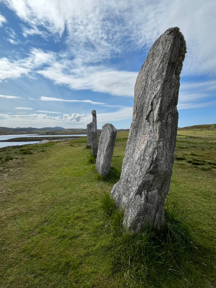 Then there are the standing stones – the most famous ones are at Callanais, a little south of Dalbeg in the west of the island, and they are strikingly positioned on a slight ridge with panoramic outlook over sea and land. It is fascinating to think that the full height of these stones (the average height is around 3 metres) was hidden for centuries, if not millenia, until the then owner of Lewis, Mr Matheson, had 1.5m of turf removed from around them in 1857.